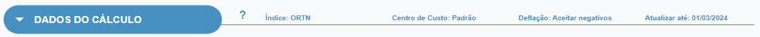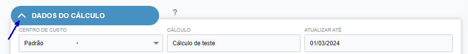 Utilize a seta no canto esquerdo do título Dados do Cálculo, para minimizar as informações do cálculo. Este procedimento serve para reduzir a quantidade de informação na tela. Será apresentado um resumo das principais informações.