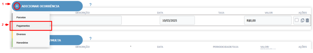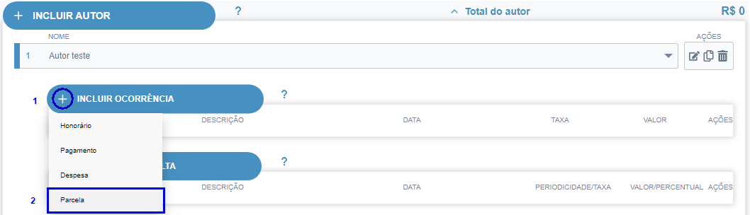 No módulo de conta corrente as parcelas são consideradas ocorrências e para inserir uma parcela será necessário ter inserido um autor. No painel de autor, temos o botão incluir ocorrência (1). Clique nele e depois clique em Parcela (2):