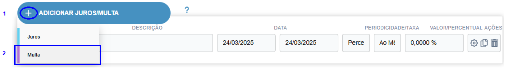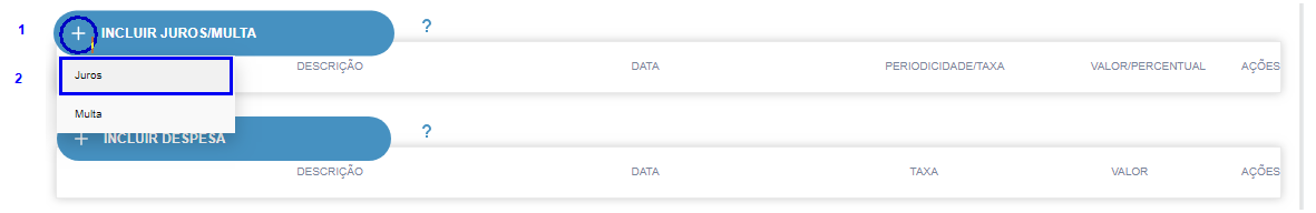 No painel de autor, temos o botão incluir Juros/Multa(1). Clique nele e depois clique em Multa(2):