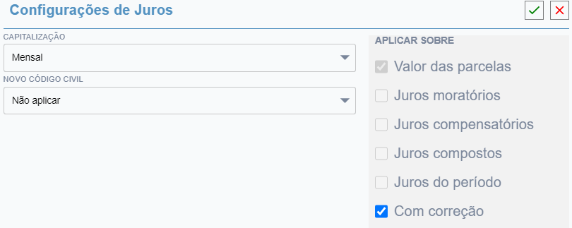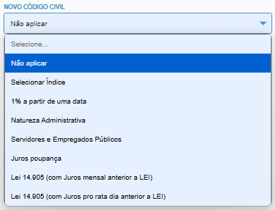 - Lei 14.905 (com Juros mensal anterior a LEI): Essa opção aplicará nos Juros a Taxa Legal, calculada de forma diária, conforme a Lei 14.905 e, no período anterior ao inícios de aplicação da LEI (30/08/2024), aplicará os juros com o percentual alimentado pelo usuário e de forma mensal.