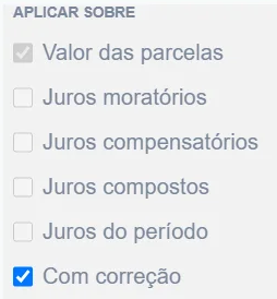 - No caso do cálculo conforme o artigo 354 (juros correm separado do principal), é possível aplicar correção monetária sobre o saldo do juros. Para isso deixe marcado, em aplicar sobre, a opção Com Correção. Dessa forma o sistema fará a correção monetário do saldo dos juros igual à correção monetária aplicada sobre o principal acumulado.