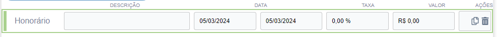 Para editar os dados do honorário, basta clicar sobre o campo desejado, no honorário a ser alterado e alterar o dado.
