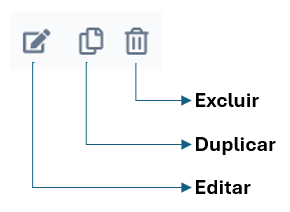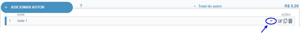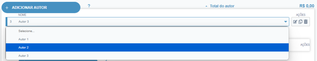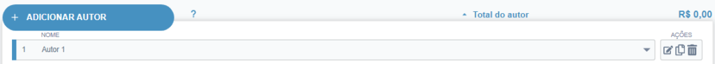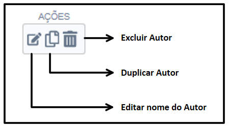 Os botões de Ações, permitem a Exclusão, Duplicação e Edição do Autor;