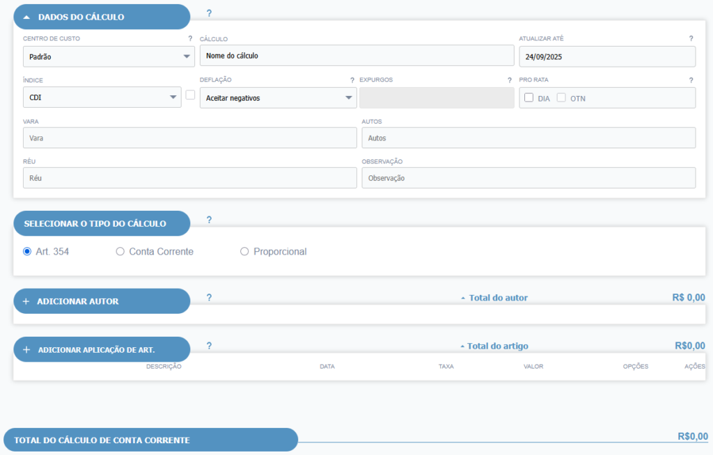 Para iniciar um cálculo, é obrigatório cadastrar pelo menos um autor, pois todas as ocorrências (parcelas do principal, pagamentos, honorários, entre outros) estão vinculadas a ele.