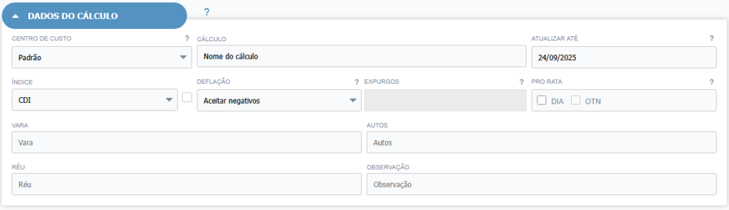Ao criar um cálculo novo ou abrir um lá existente, na parte superior da tela, será exibida uma área destinada as informações iniciais do cálculo: