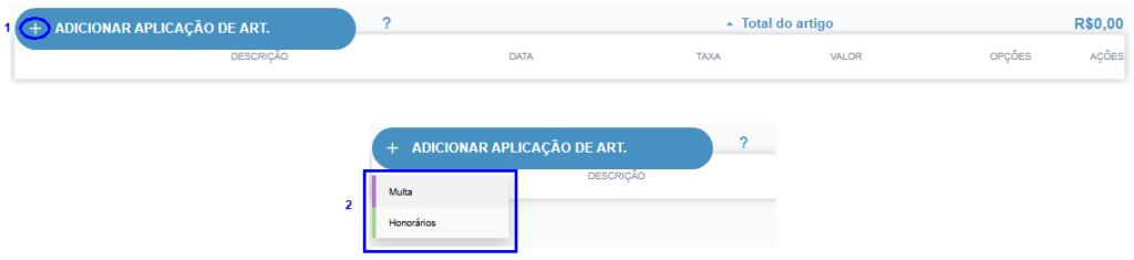 Pode ser utilizado, por exemplo, para a aplicação do Artigo 523 ou Artigo 774 do CPC. Para adicionar o artigo, clique no botão (1)Adicionar Aplicação de Art. e selecione (2)Multa ou Honorários: