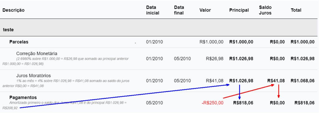 No exemplo acima, na data de 05/2010 houve um pagamento no valor de R$250,00, nessa data o valor dos juros acumulados era de R$41,08. Então ele amortizou o saldo dos juros, e o restante (R$250,00 – R$41,08 = R$208,92) ele abateu do principal, que na época era de R$1.026,98. Ficando um total de R$818,06.