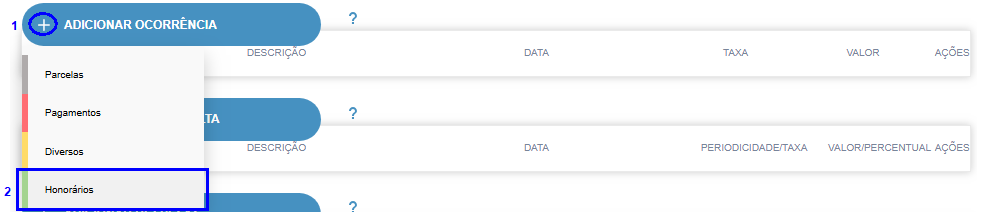 No painel de autor, temos o botão incluir ocorrência (1). Clique nele e depois clique em Honorário(2):