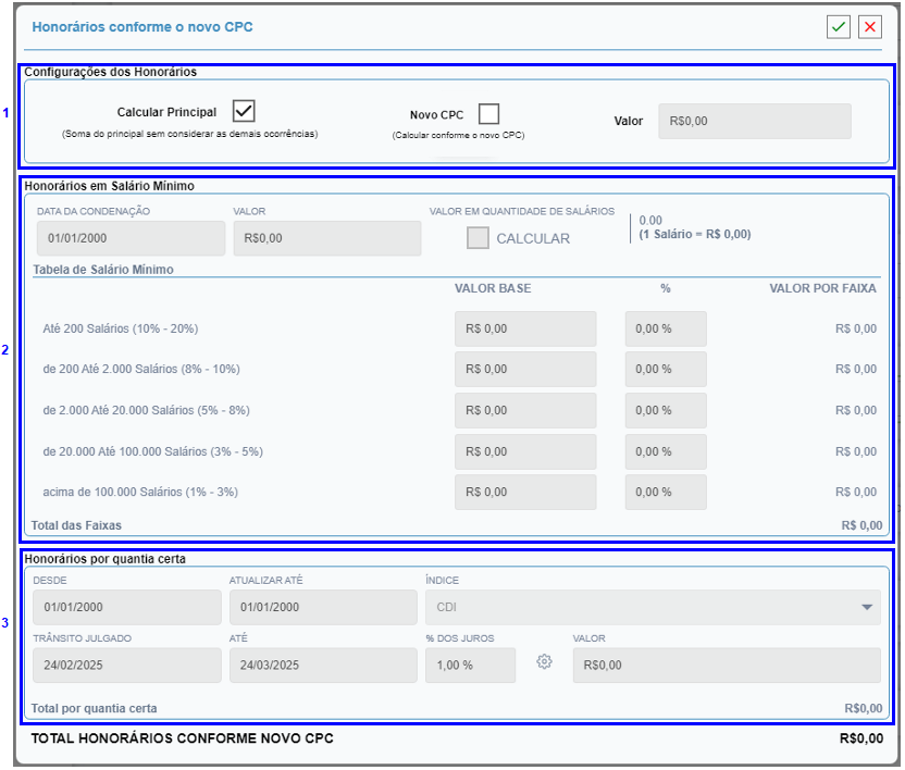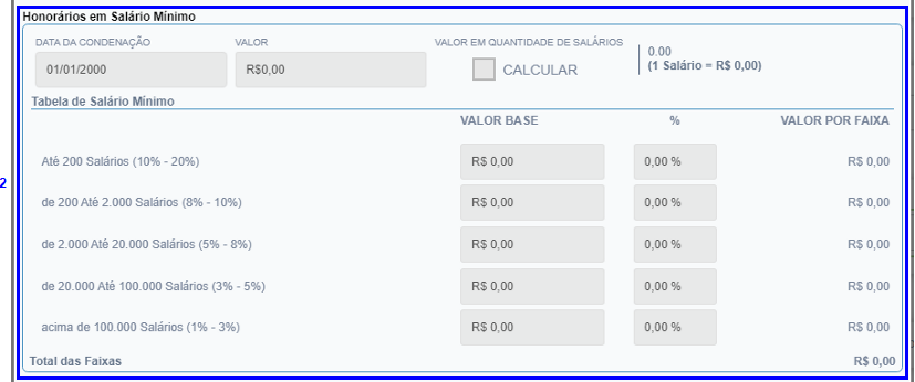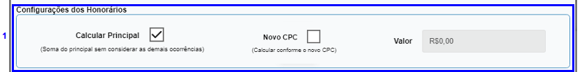 O cálculo do honorário será efetuado sobre esse valor se ele for maior que R$ 0,00, caso contrário o sistema levará em consideração o valor total do cálculo na data do honorário.