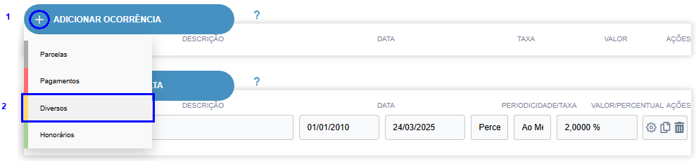 Data da ocorrência Diversos. A partir dessa data, o sistema incluirá o valor da ocorrência Diversos no Principal e passará a aplicar a correção monetária e os juros que estiverem configurados.