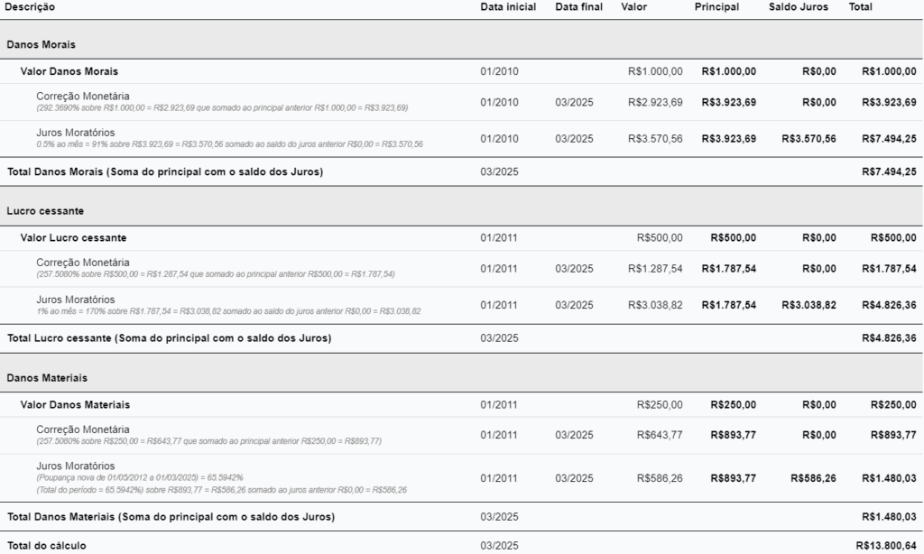 No exemplo acima, aplicamos diferentes percentuais de juros para cada item: 0,5% ao mês para (Autor 1) Danos Morais, 1,0% ao mês para (Autor 2) Lucro Cessante e juros da poupança para (Autor3) Danos Materiais.