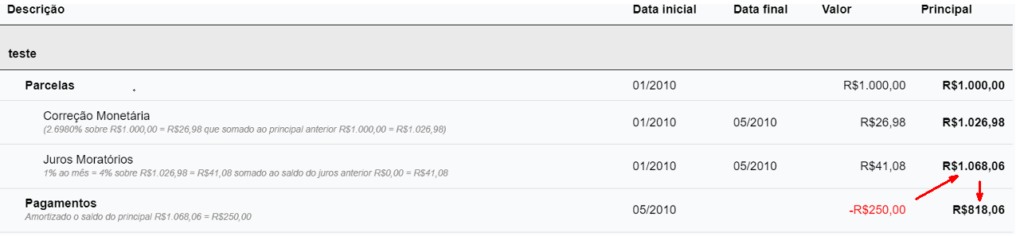 Na imagem acima podemos verificar que houve um pagamento em 05/2010 no valor de R$250,00, o sistema abateu esse valor do total do cálculo que nessa data era de R$1.068,06.