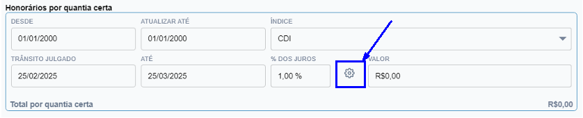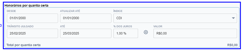 Para efetuar a correção monetária e aplicação de juros aos honorários, utilize os Honorários por quantia certa. Aqui é possível informar o período de correção monetária, o índice que deve ser aplicado para a correção e, se necessário, o período e percentual de juros. Aqui os juros são aplicados de forma Simples, ou seja, não são capitalizados (juros sobre juros).