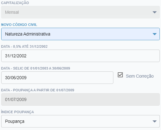 - Natureza Administrativa: Nesta opção os juros serão configurados para aplicar 0,5% até 31/12/2002. Em seguida irá aplicar a taxa Selic de 01/01/2003 até 30/06/2009. Neste período em que a taxa Selic for aplicada, não haverá correção monetária do principal. Após 01/07/2009, será aplicado o índice da poupança. As datas de aplicação podem ser alteradas, menos da poupança.