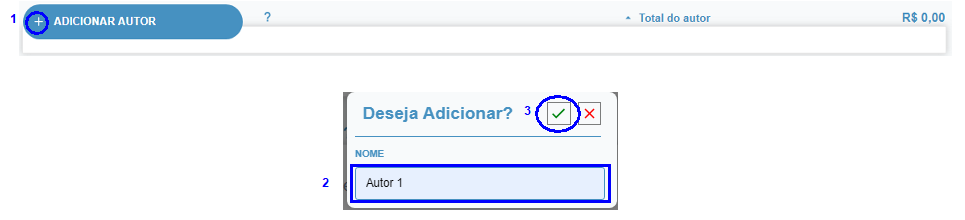 Para inserir autor clique no botão Adicionar Autor(1), depois digite o nome(2) e clique no botão confirmar(3).