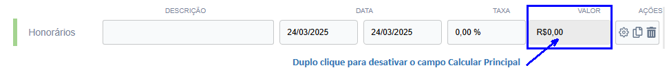 Também é possível efetuar alterar essa opção sem clicar no botão de configurações. Para isso efetue um duplo clique dentro do campo Valor, na linha dos honorários. Após efetuar o duplo clique, será possível digitar o valor desejado para o cálculo dos honorários.