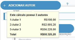 Ao posicionar o cursor sobre o botão “Adicionar Autor”, o sistema exibe um resumo detalhado, apresentando o valor total correspondente a cada autor no cálculo: