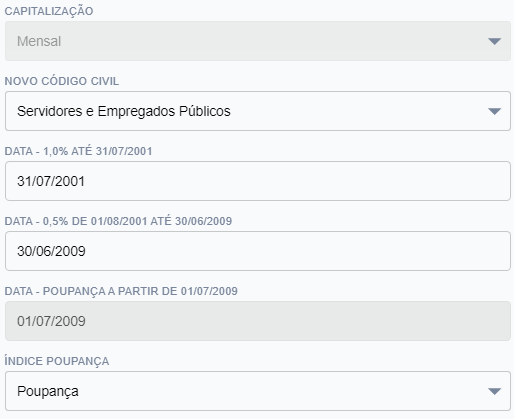 Servidores e empregados públicos: Nesta opção os juros serão configurados para aplicar 1% até 31/07/2001. Em seguida irá aplicar a taxa de 0,5% de 01/08/2001 até 30/06/2009. Após 01/07/2009, será aplicado o índice da poupança. As datas de aplicação não podem ser alteradas.