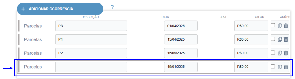 Adicionar parcela após a última ocorrência. (Observação: Ao clicar em visualizar ou imprimir, o sistema ordena as parcelas de forma cronológica)