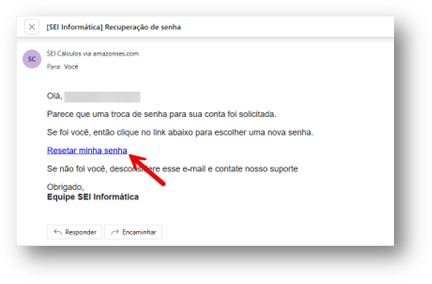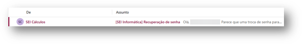Verifique sua caixa de entrada. Você receberá um e-mail com o assunto “[SEI Informática] Recuperação de senha” enviado pelo SEI Cálculos.