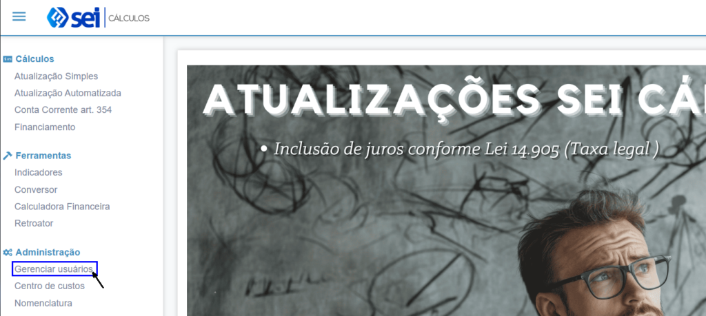 Para gerenciar as suas licenças adicionais do SEI-Cálculos, adicionando, alterando ou excluindo usuários, clique na opção Gerenciar usuários, que fica no menu lateral: