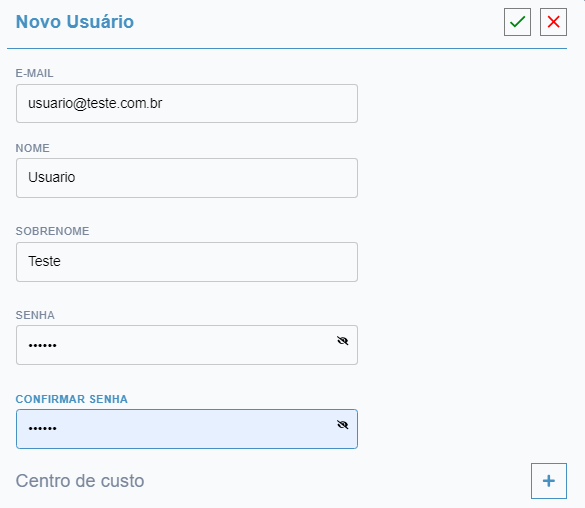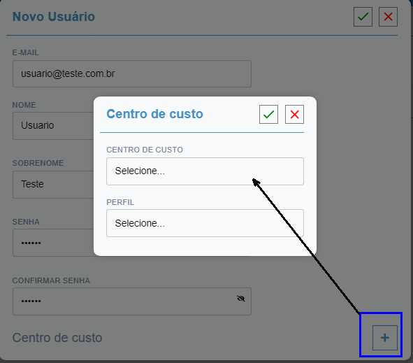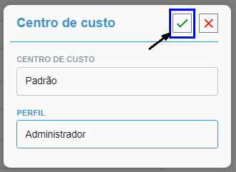 Após preencher os dados, clique no botão adicionar, na parte inferior da tela e selecione os centros de custos que serão liberados para esse usuário e o perfil:
